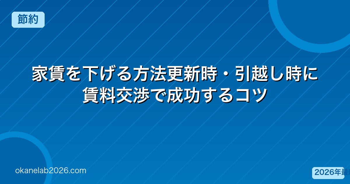 家賃交渉の成功率は「タイミング・根拠・誠実なコミュニケーション」の3点で大きく変わります。更新時に「近隣相場の調査結果を見せながら礼儀正しく交渉する」と応じてもらえるケースが多いです。家賃を5,000円下げることに成功すれば年間6万円の節約になります。引越しせずに家賃を下げる交渉は、最もコスパの高い節約手段の一つです。断られても「フリーレント(1〜2ヶ月の家賃無料期間)」や「設備の修繕・交換」など別の形での交渉も有効です。